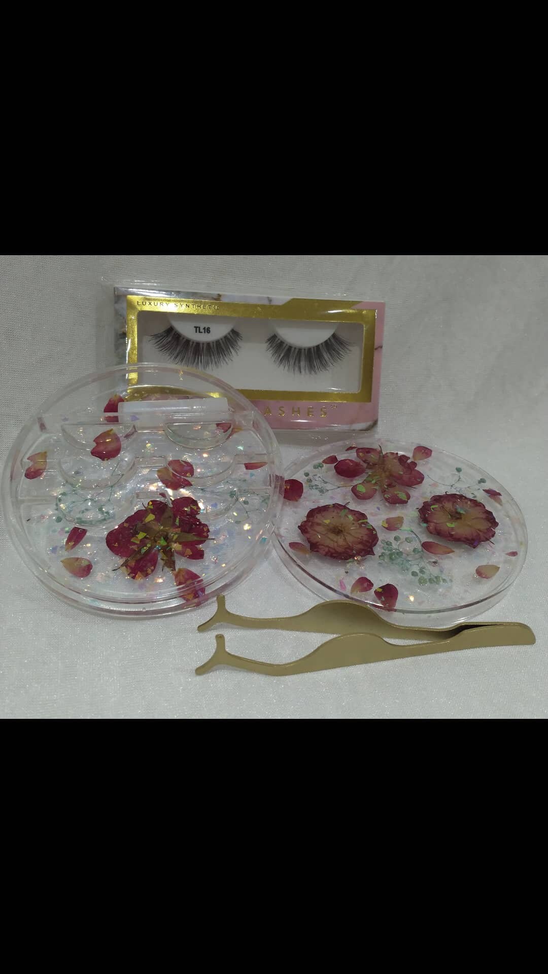 I have created this beautiful false eyelash case/holder using resin and real flowers and iridescent mylar flakes. It measures 9.5cm diameter and 2cm tall. It has 3 sections for 3 sets of eyelashes, and it has space for eyelash glue too.Really beautiful piece. **Eyelashes and accessories not included.**